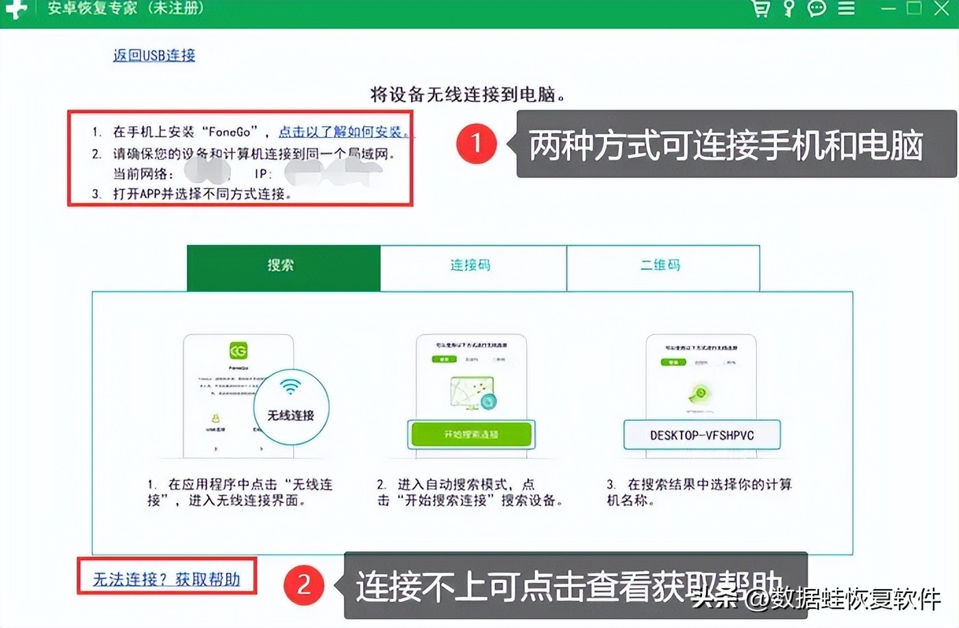 步骤1:下载安装完成后,电脑打开软件,按照指引连接手机。这里小编推荐使用USB有线连接,传输更稳定。