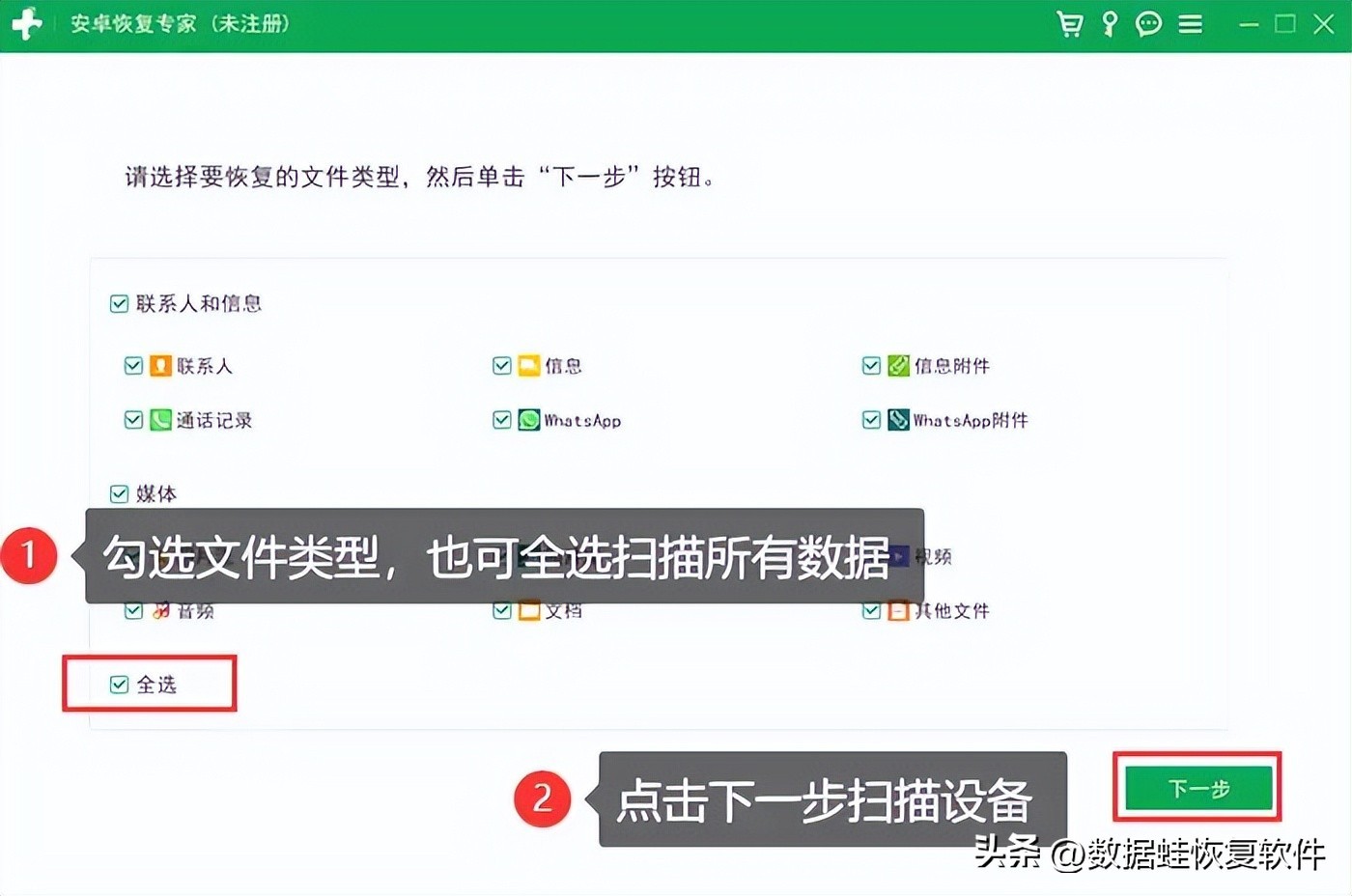 步骤2:连接完成后根据软件的页面和提示,选择适合手机数据恢复的选项,例如文件类型可根据自己所需要的来勾选,也可全选,选择完成后点击【下一步】即可开始扫描手机内的数据。