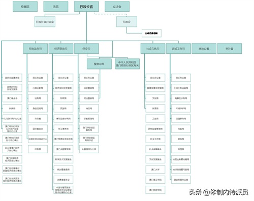 澳门的检察院、法院、行政长官、立法会共同组成治理澳门的整体架构,彼此属于分立,互不干涉。此处,我们单说以行政长官为首的行政管理架构。包括三个层次: