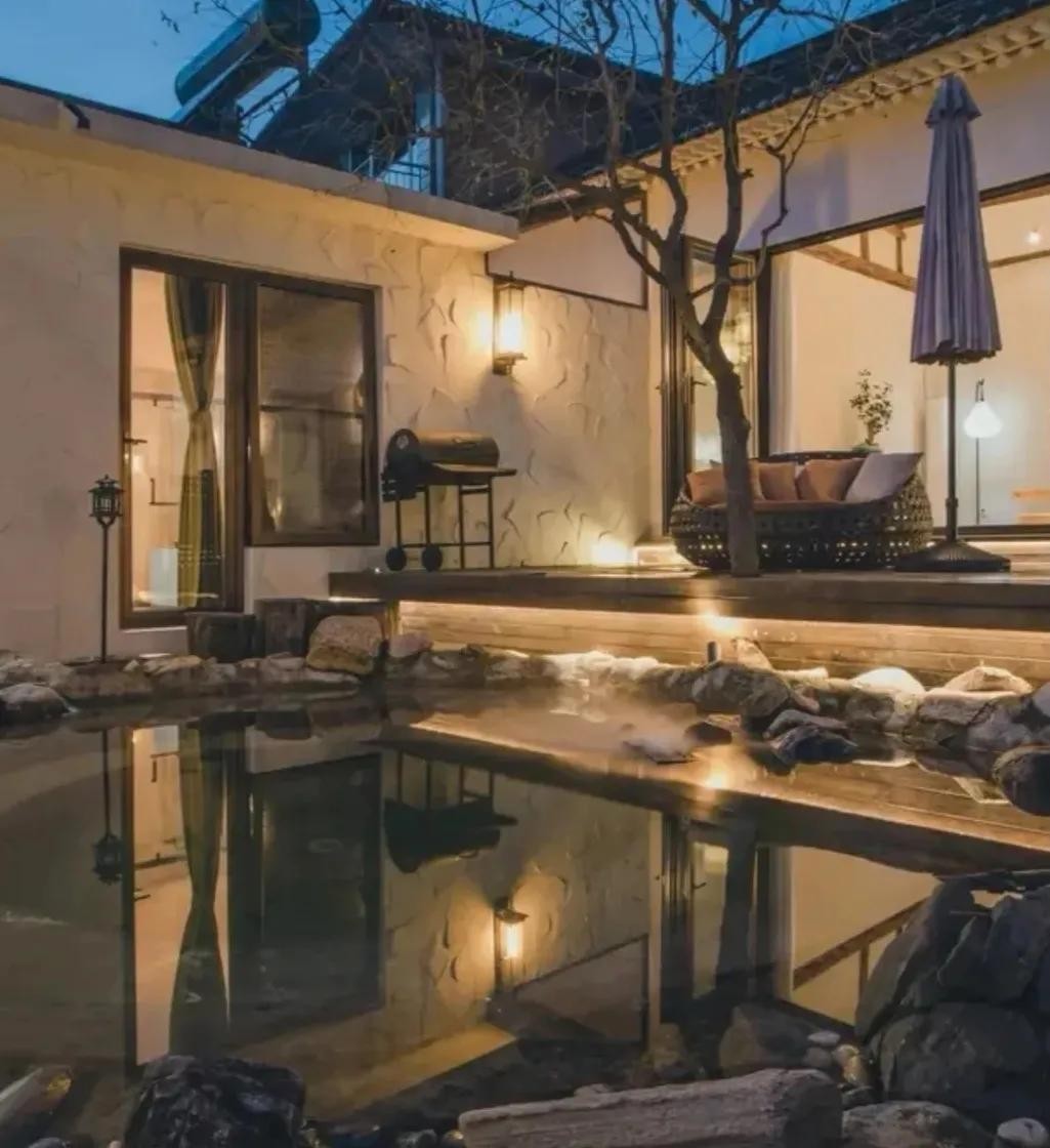 归隐仙居入院即池,四季皆景,夏有荷花,冬有落雪。每栋院落独门独户,客房宽敞明亮,山景走进院落,月色洒满汤池。