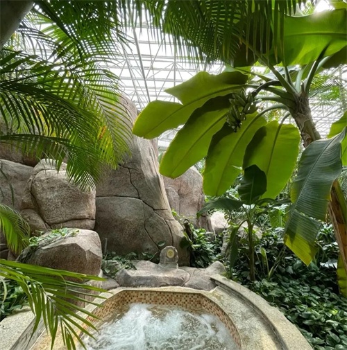 凤山温泉来自地下3800米深的天然温泉水。室内温泉为热带雨林风情,四季葱绿。有休闲养生为主的药浴,还有具有按摩功效的各种动态水疗浴等。