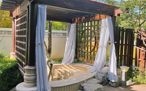 室外露天温泉依山势而建,十余个温泉小池隐藏在松柏、果树、花草中,亭台相间,清幽雅致。