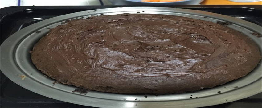 之后取1/3的蛋白,放入巧克力溶液当中,用刮刀将它们搅拌均匀,再放入低筋粉和泡打粉的混合物,一起搅拌均匀。再将剩余的蛋白全部都倒进去,用刮刀搅拌均匀。此时的我们需要取6寸的蛋糕模,倒入蛋糕糊,表面抹,就可以放到烤箱当中烤。