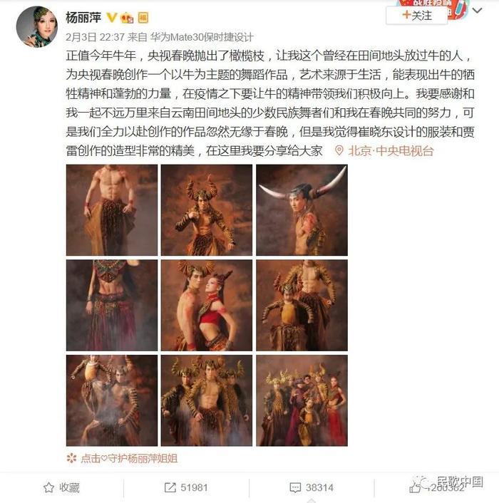 她表示,自己曾受到央视春晚邀请,以“牛”为主题创作一个舞蹈作品,但遗憾最终无缘春晚。在向与自己一起参与创作的小伙伴们表示感谢的同时,杨丽萍还分享了这一作品原来的服装设计和造型。