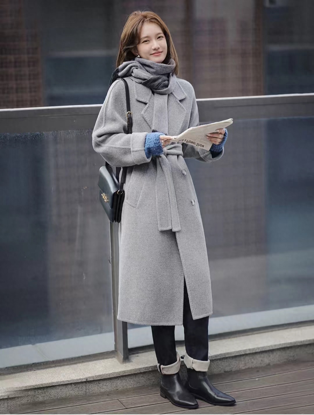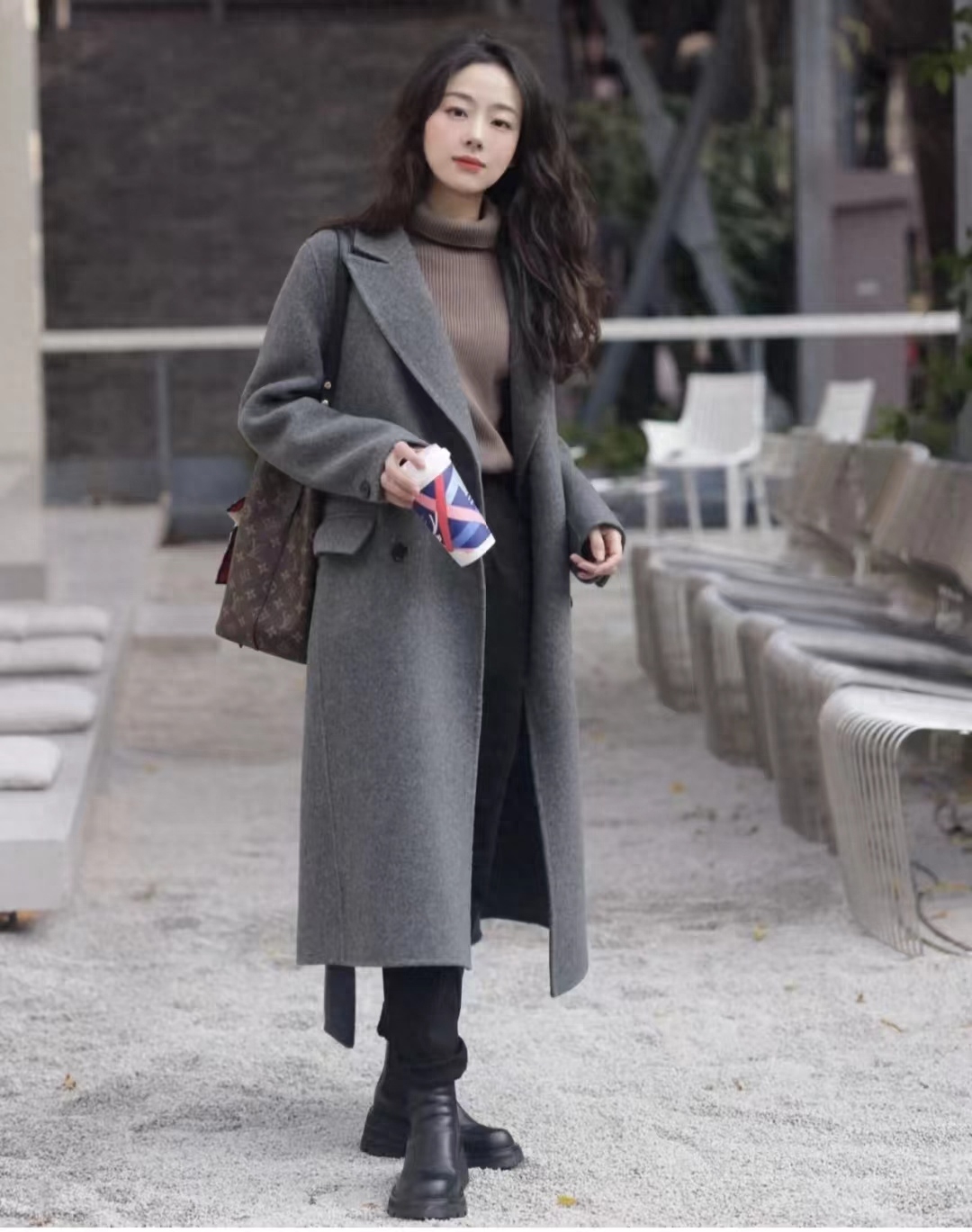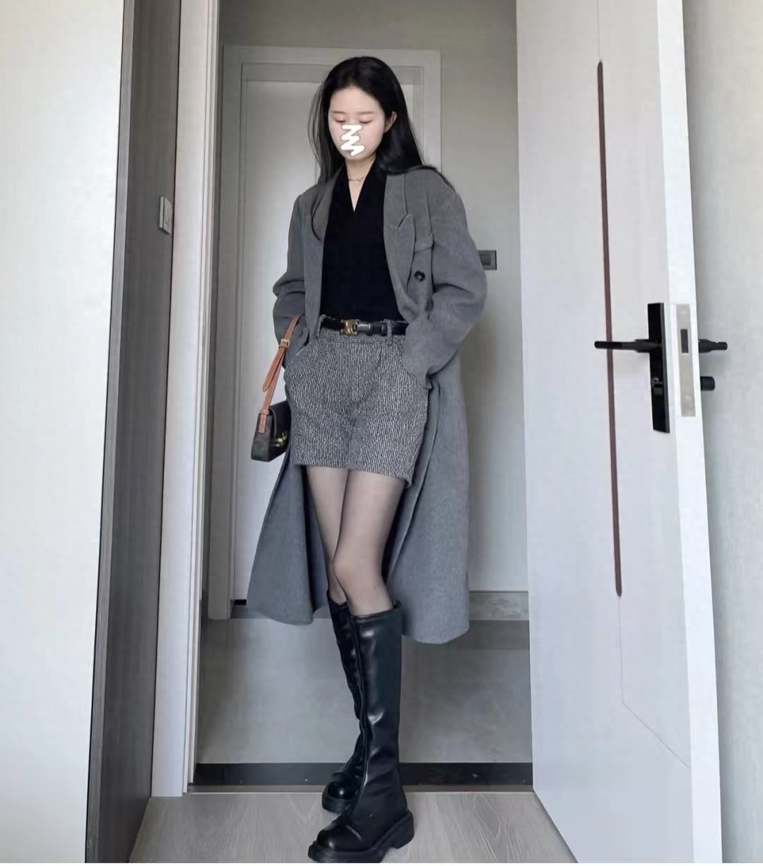 look12 灰色大衣+黑色针织/黑短款/长靴