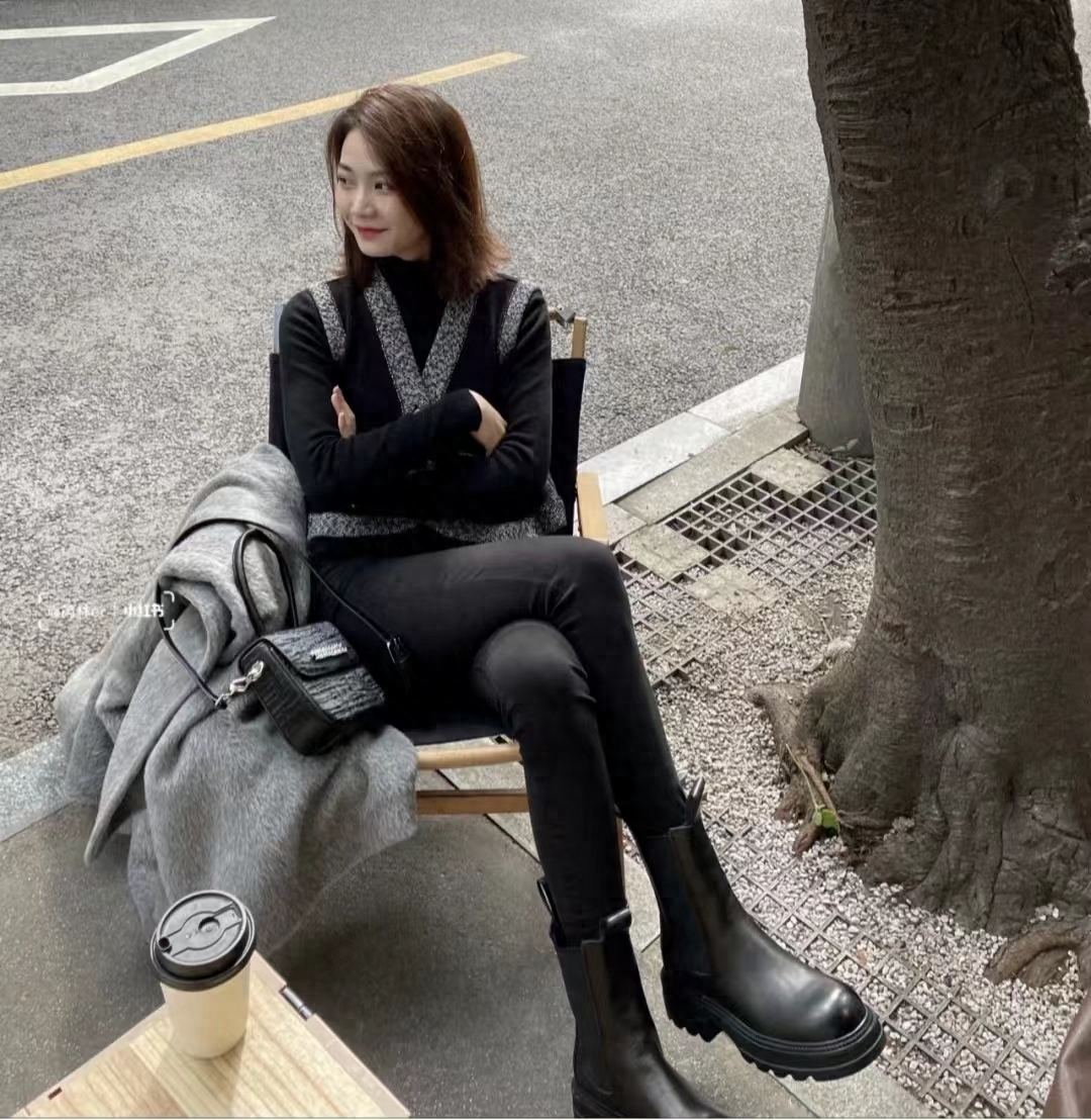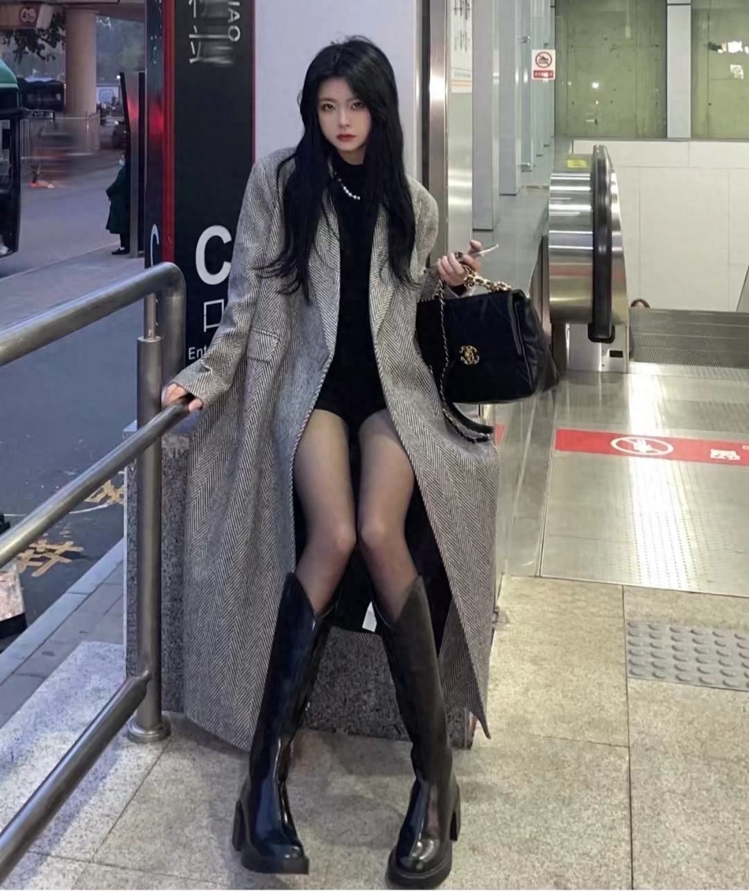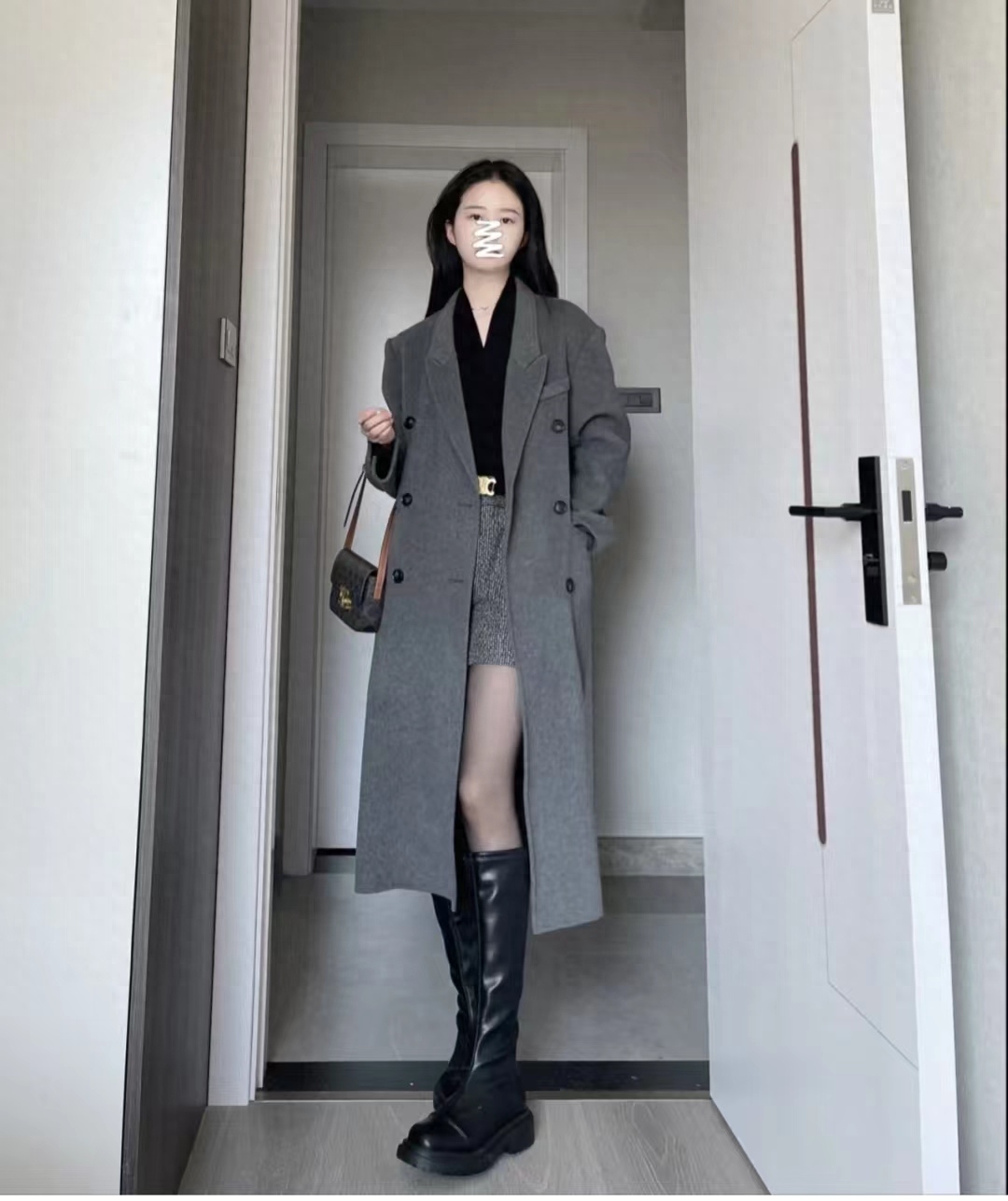 look12 灰色大衣+黑色针织/黑短款/长靴