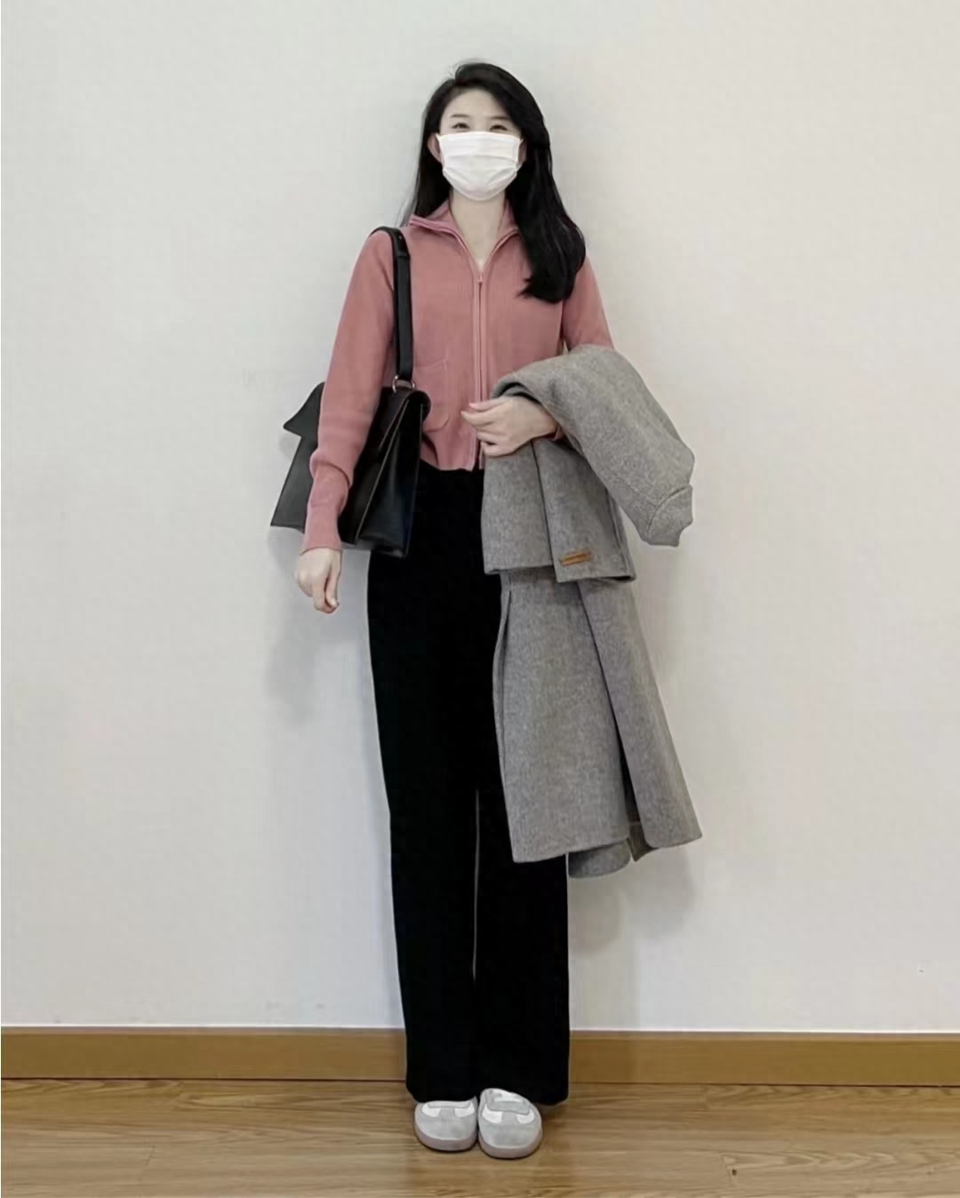 look13 灰色大衣+粉色拉链毛衣/宽松裤