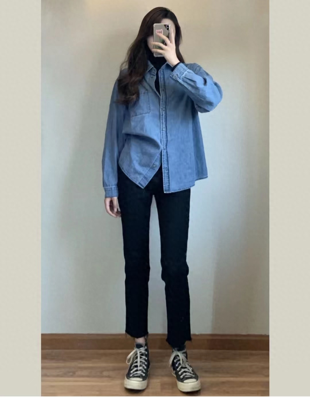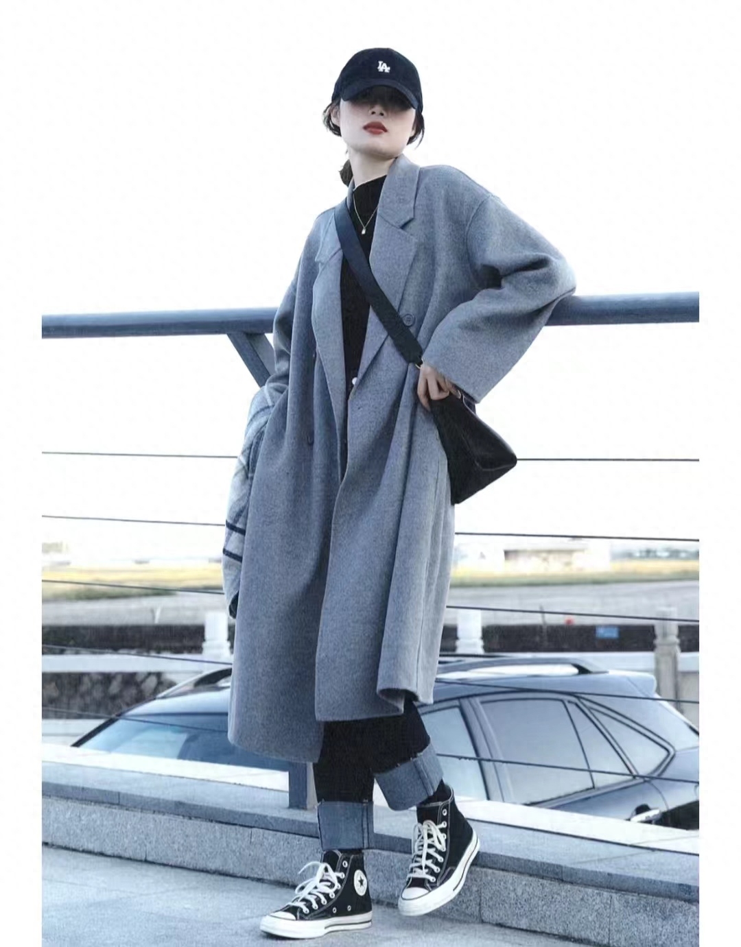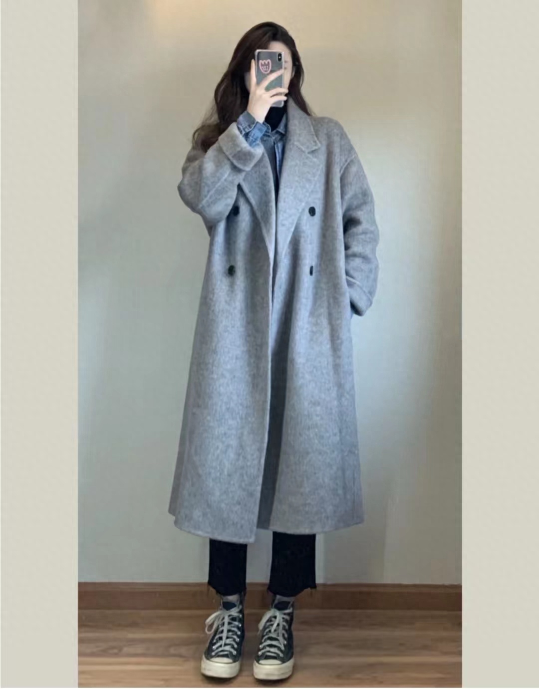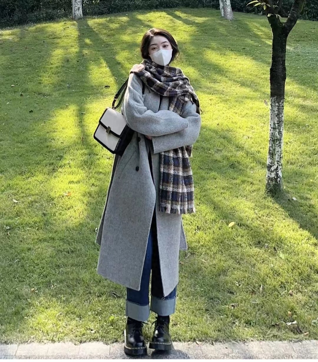 灰大衣显高级,版型大气耐看,叠穿高领打底衫和牛仔衣高级感upup,下半身搭配黑色毛边九分牛仔裤和帆布鞋,一套韩系叠穿氛围感满满~~