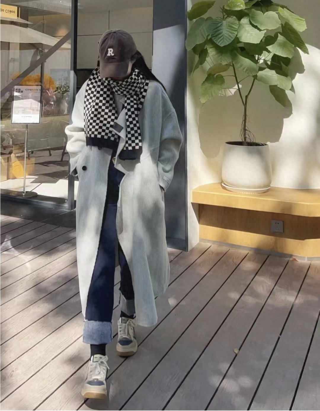 look1 灰色大衣+宽松牛仔裤/格纹大围巾