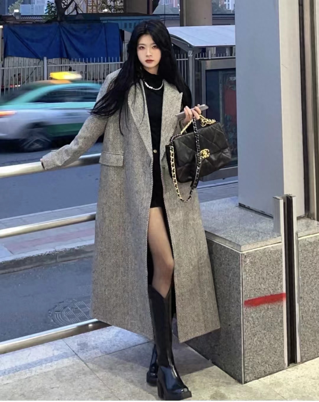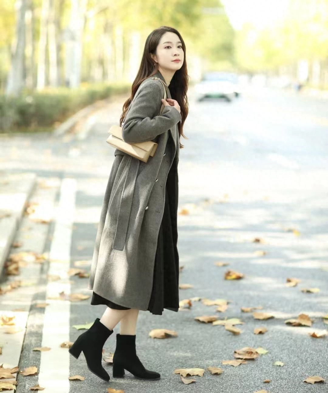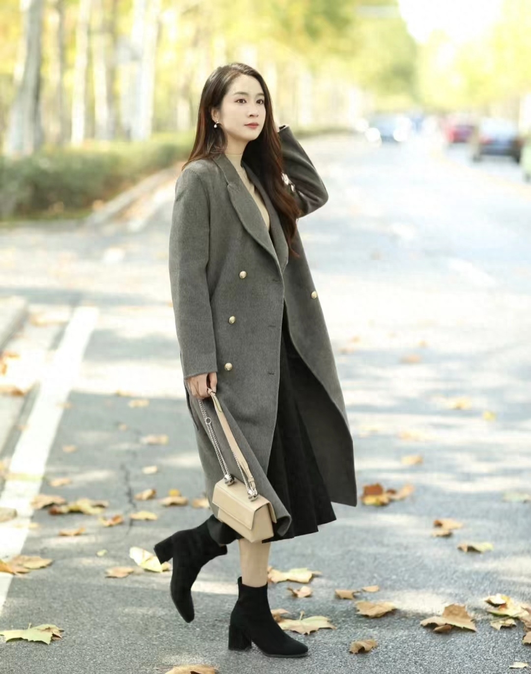 冬天不能没有一件深灰色大衣,配黑色内搭真的很高级,搭小亮钻包绝了,包包的颜色和脚上的靴子相呼应,一套高级感满满~~