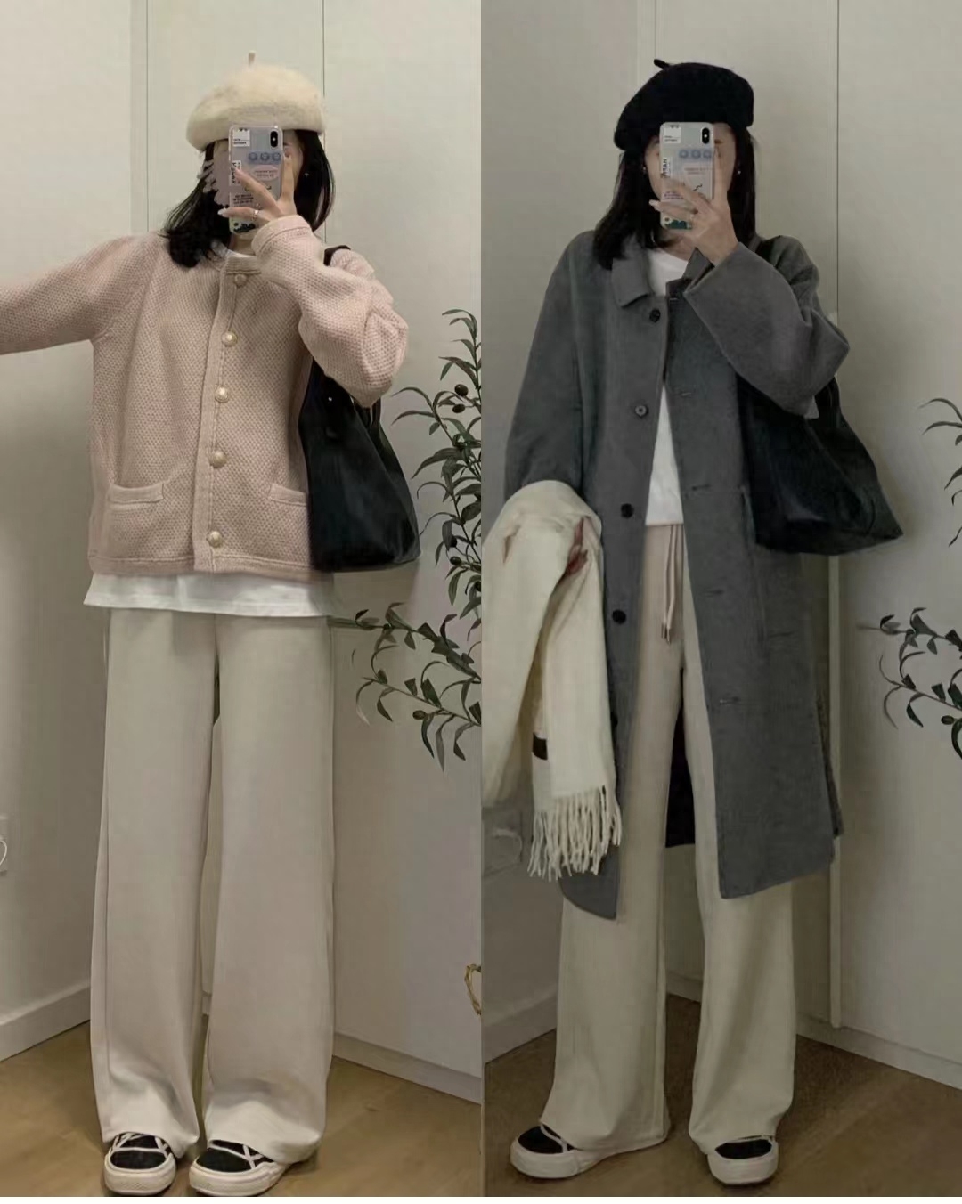 look5 灰色大衣+米色毛衣/藏青色阔腿裤