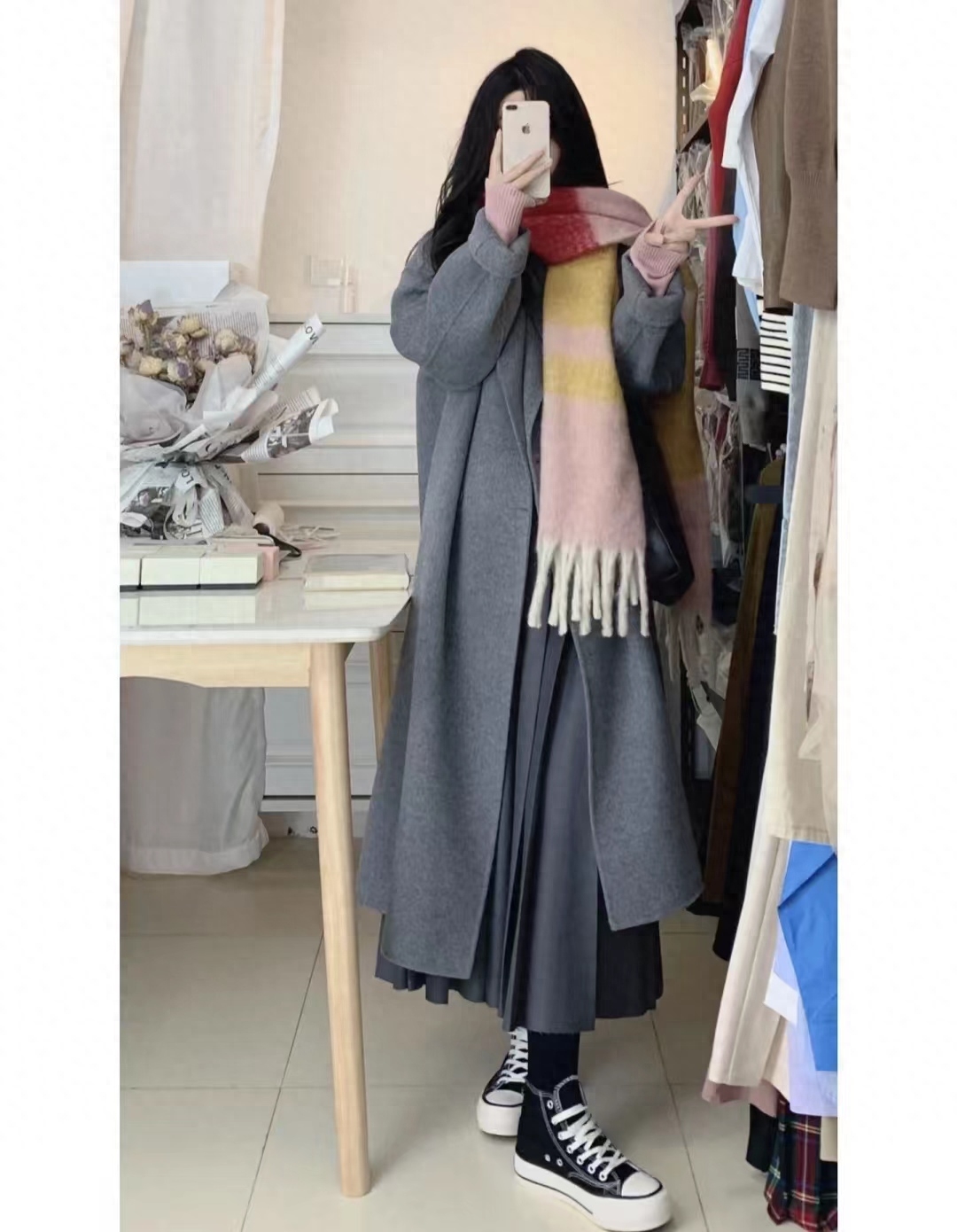 大衣毛衣:今日知何;裤子:致物8118;围巾:美韩逗逗