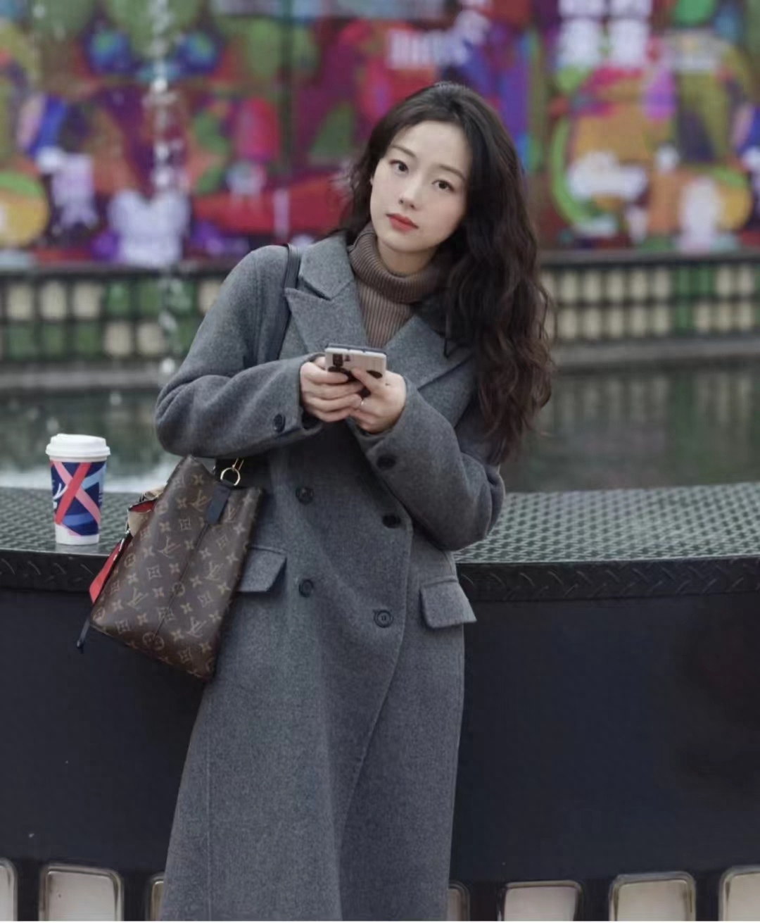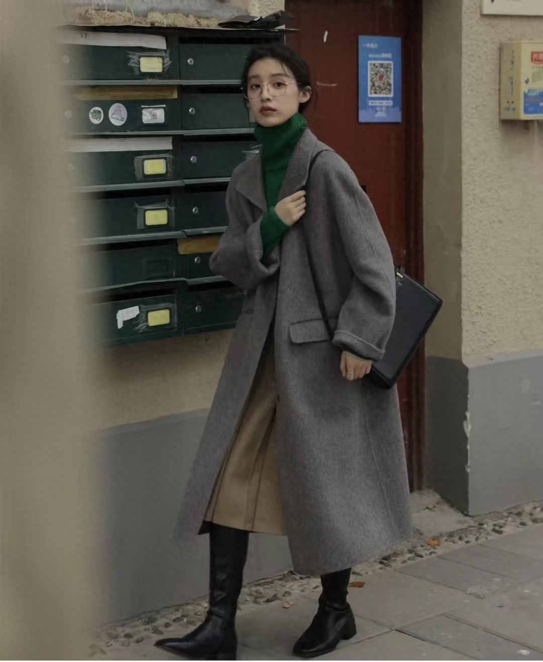 灰大衣上身明白为什么这个颜色叫高级灰了,灰色太显质感显气质了,双面羊毛大衣厚度和重量都足够,深藏青色阔腿裤加绒又挺又厚实,也是显质感颜色,绿色链条包包点缀灰色高级感满满~~