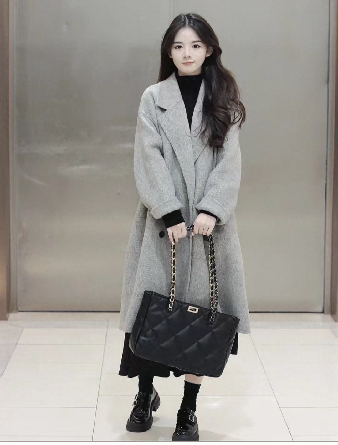 look14 灰色大衣+白色打底/黑金包包