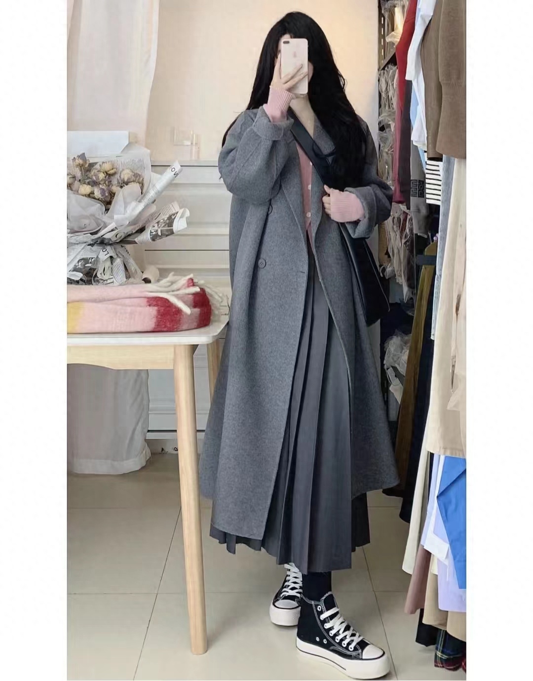 去年入的灰色大衣拿出来依然好喜欢,灰色就很韩系气质,搭裙子裤子都可,里面还可以穿针织衫,灰粉配我的爱~~