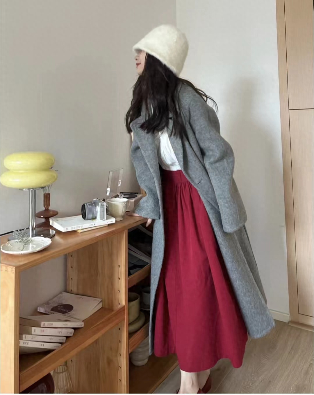 look8 灰色大衣+法式白衬衫/红色伞裙