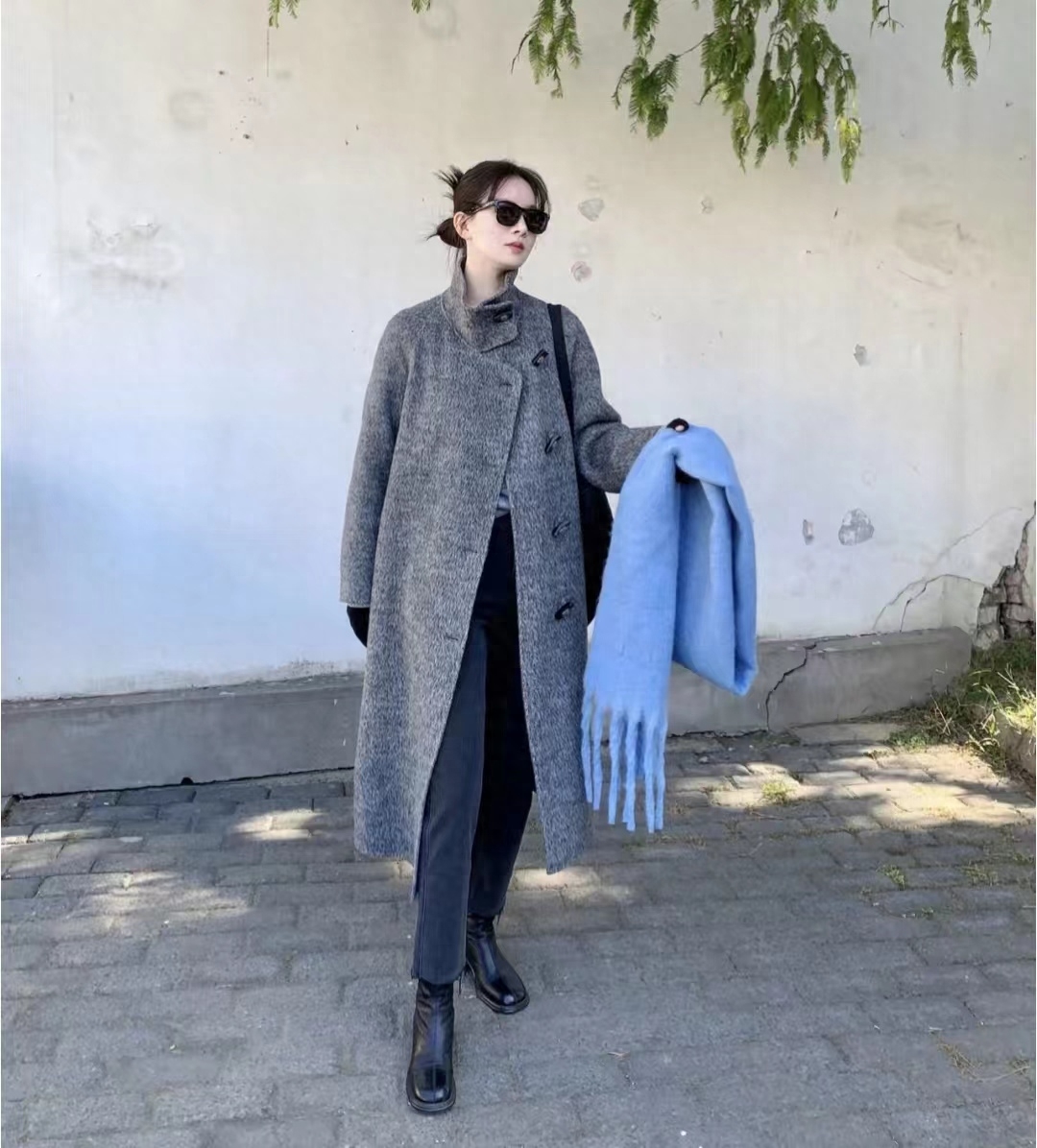 灰色大衣真的是秋冬经典,大衣的灰点缀蓝色围巾简简单单,却又氛围感满满,仿佛晴空万里难得的清爽冬日~~