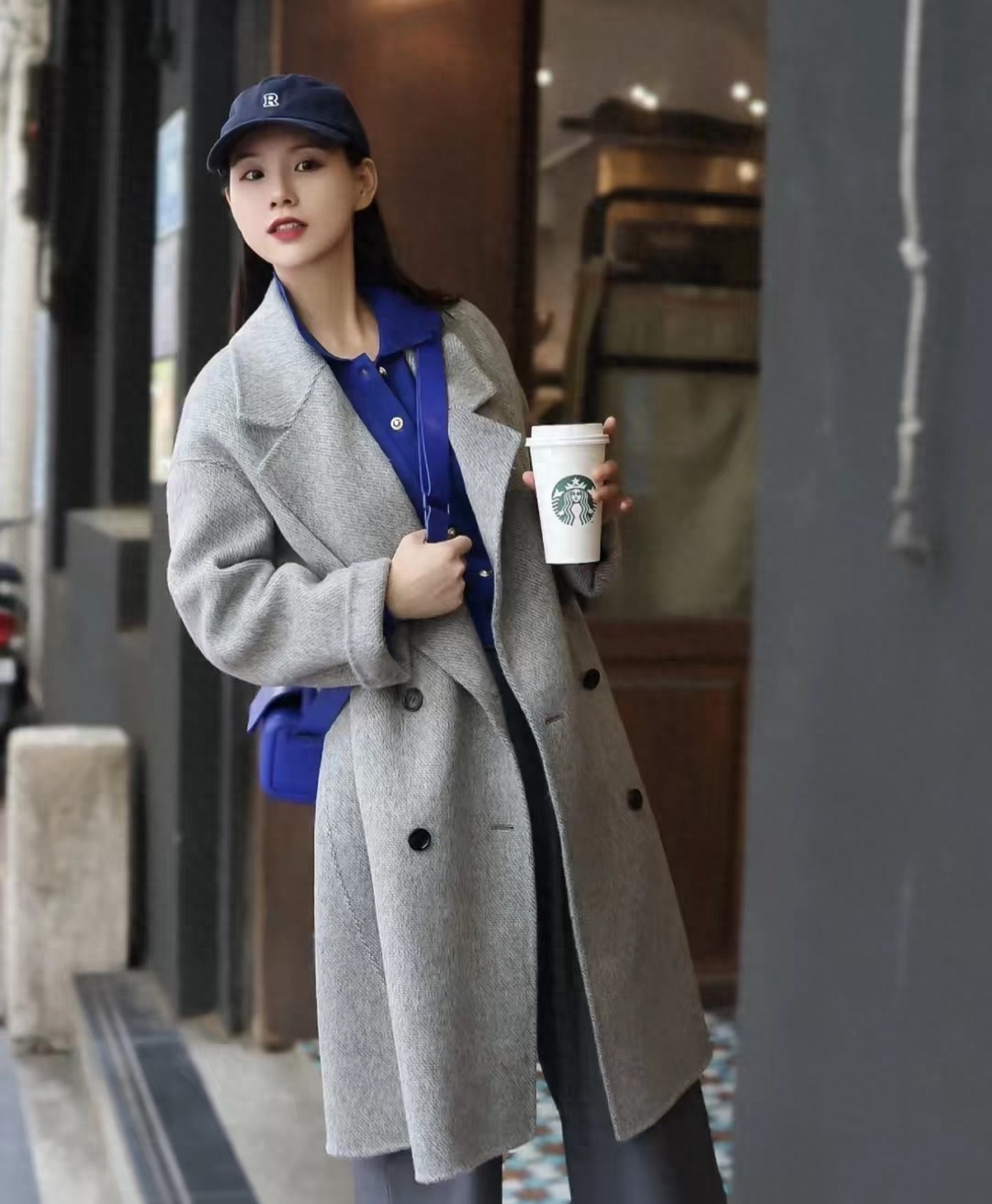 look22 灰色大衣+克莱因蓝针织/灰色西装阔腿裤