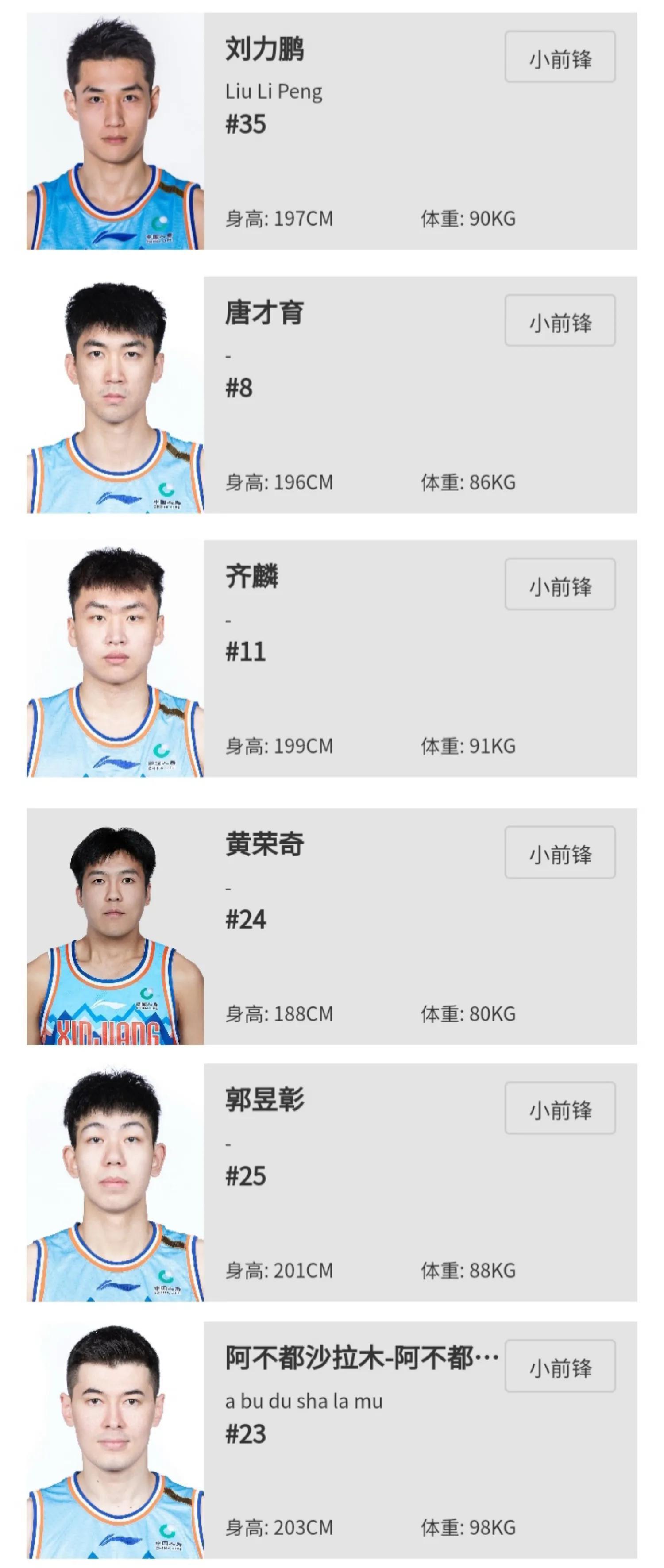 小前锋球员是新疆队的优势,可谓是人才济济,刘力鹏、唐才育、齐麟、黄荣奇、郭昱彰、阿布都沙拉木这6人都是小前锋,新疆队的队长和副队长都在这里面。