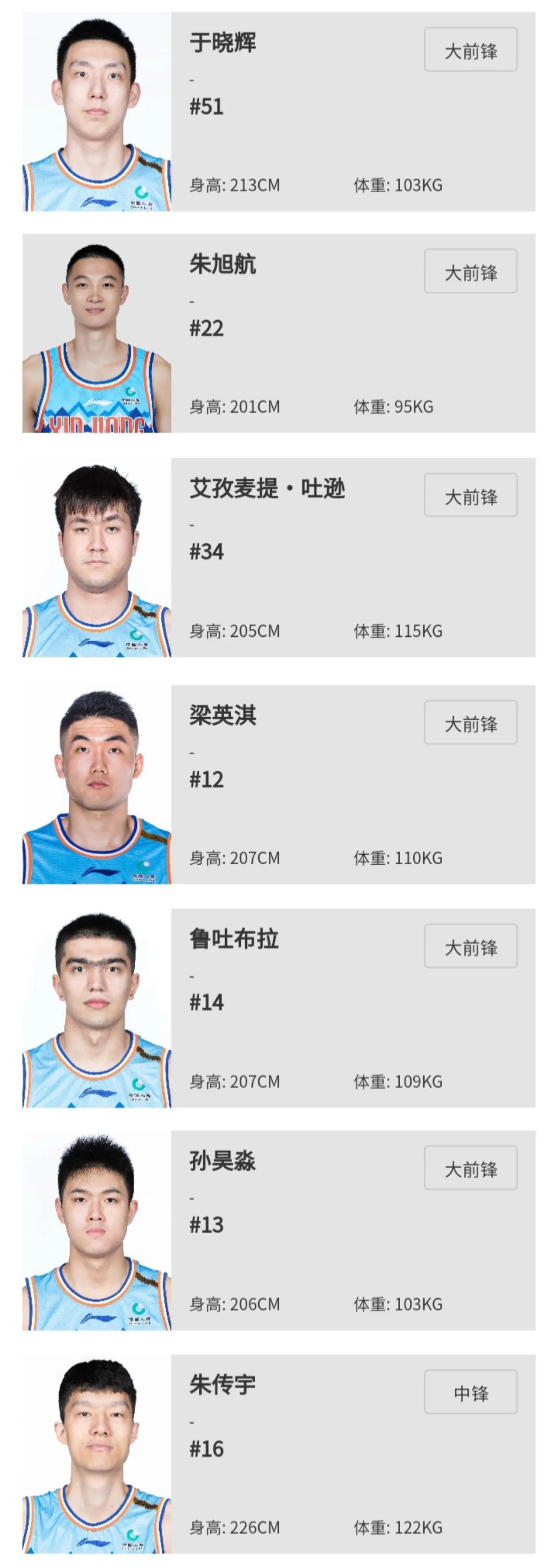 新疆队有6个大前锋,1个中锋,都属于内线球员。于晓辉、朱旭航、艾孜麦提、梁英淇、鲁吐布拉、孙昊淼,这6人是大前锋,有时候阿布都也打大前锋的位置。