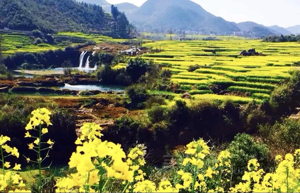 如果你想近距离欣赏这片花海,可以选择步行或者乘坐小车穿行其中,如果你想俯瞰整个花海,可以选择登上山顶的观景台,一览无余。这几个油菜花比较集中好看的地方记得收藏,一个就是金鸡峰,登上金鸡峰看油菜花田比较平坦,而稍远处有些孤峰拔起,很是壮观。二是多伊河风景村,这里地形起伏较大,花田随地形梯田种植,富于变化,是拍照的好地方。三是城北的牛街乡,这里有梯田,梯田上有的种油菜,有的种小麦、蔬菜等,各种色块交织,也别有韵味。还有一处不仅有好看的油菜花,还有壮观的瀑布群,就是九龙瀑布景区。