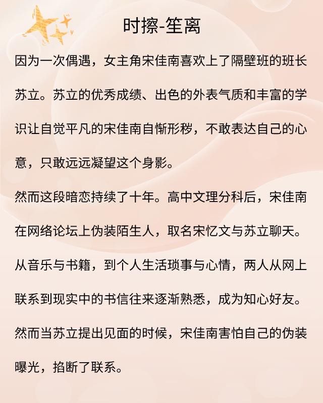 《时擦》讲述的是宋佳南与苏立的暗恋故事,在这场爱情里,无疑是宋佳南付出得更多,因为最开始动心的人是她。