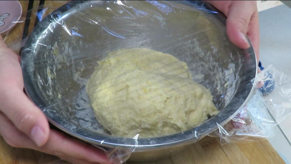 3、然后盖上保鲜膜,醒发至两倍大,大约45分钟左右,即可