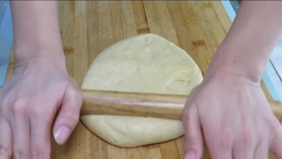 4、然后我们将醒发好的面团取出来,先揉搓一下,然后再擀成饼状,不能太薄