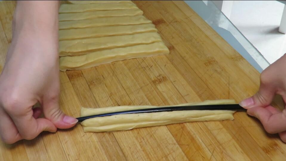 5、然后把饼切成宽片,尽量切的大小均匀,然后将切好的两片叠加一起,然后拿一根筷子压一下,这样全部叠加好即可