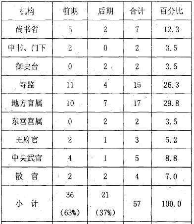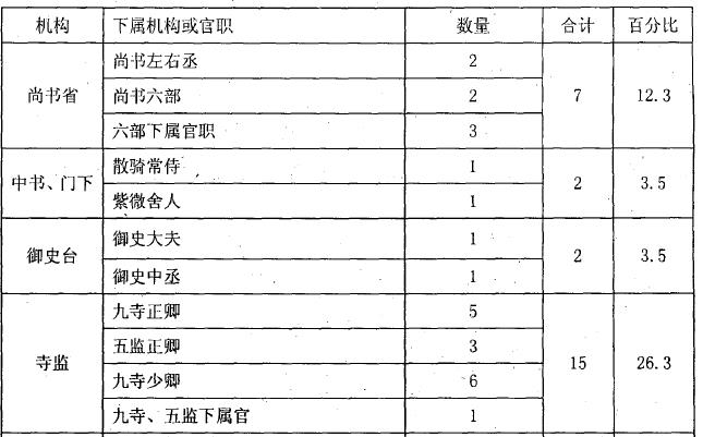 从上图我们就可以看出,太仆寺丞来自尚书省六部的人数为2人,尚书省六部下辖官职人数为3人。来自尚书省的官员人数共七人,占比为12.3%。来自寺监的人数最多,其中九寺正卿为5人。五监正卿为3人。九寺少卿6人。来自世间的人数总和为15人,占比为26.3%。