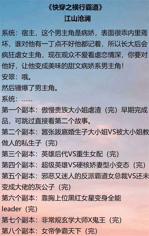 以前也推过一期无CP女主向快穿爽文,再推一期其他作者的。推荐的都是中短篇,个人觉着长篇地看下来有点视觉疲劳。