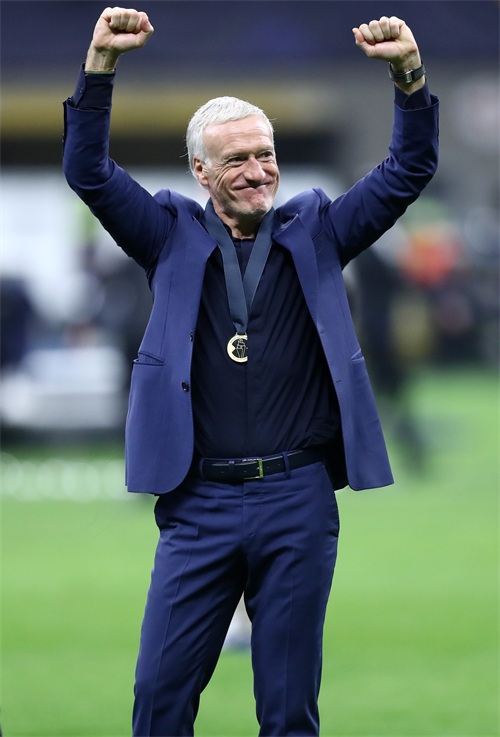 10月10日,法国队主教练德尚在颁奖仪式后庆祝。