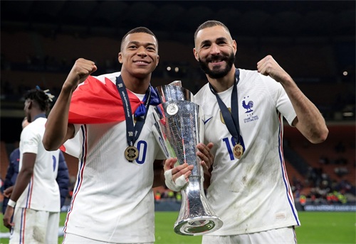 10月10日,法国队球员本泽马(右)与姆巴佩手举冠军奖杯庆祝。