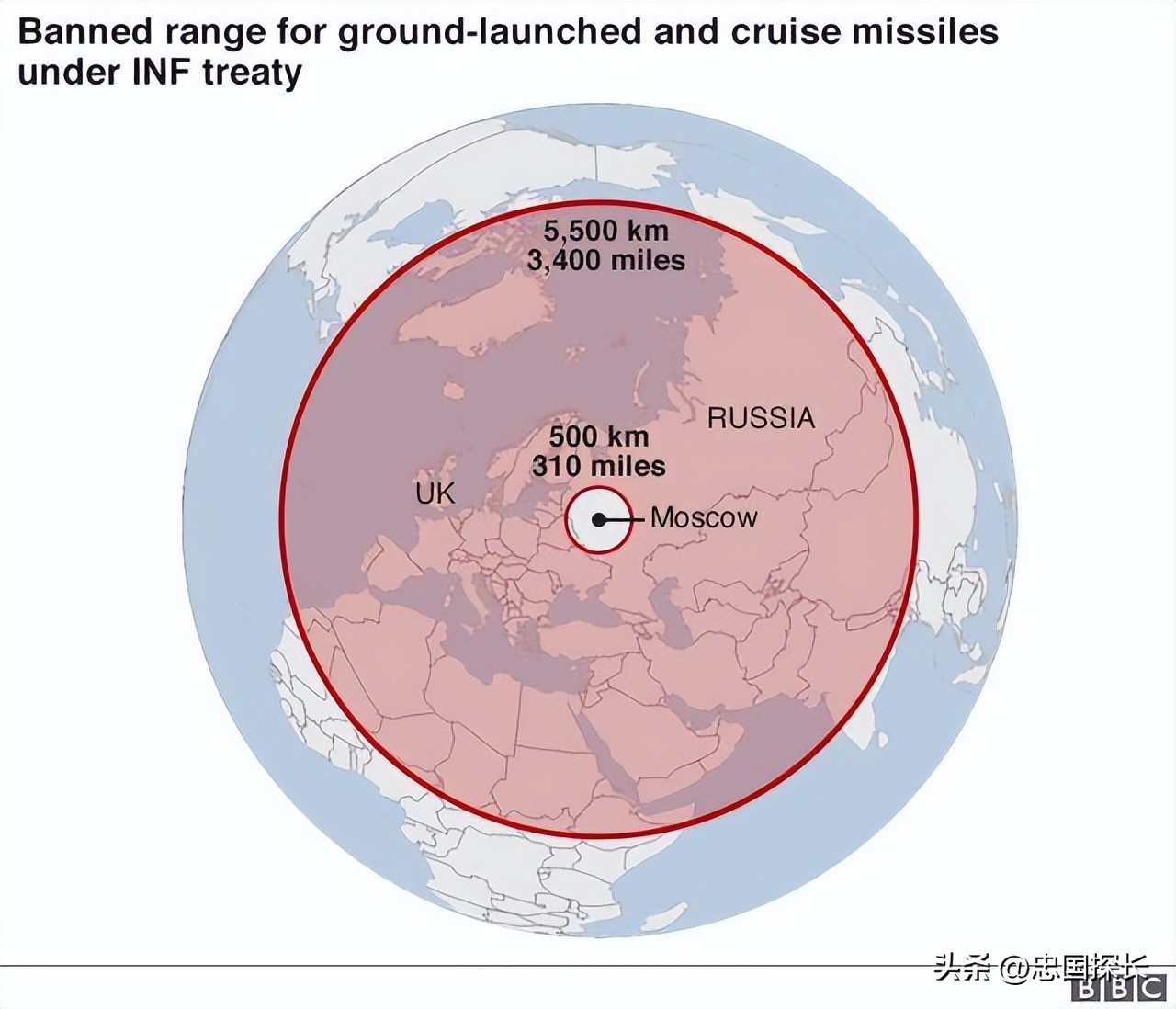 500公里,是以美国和苏联核心区所需的安全距离为半径,圆一个圈,射程在500公里以下的导弹,都无法直接对两国的核心地带构成威胁。在地图上,我们一看就明白了,北约任何一个地方距离莫斯科的距离都超过了500公里,更不用提苏联到美国的距离了。