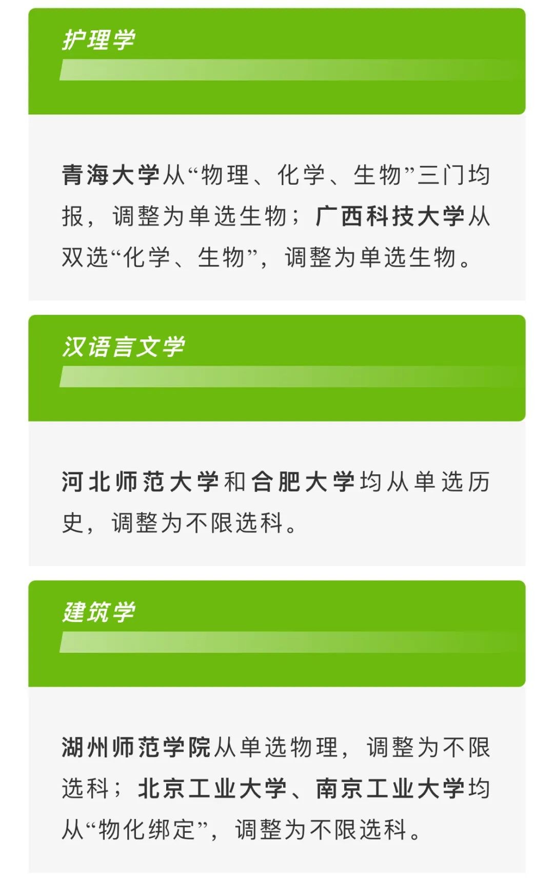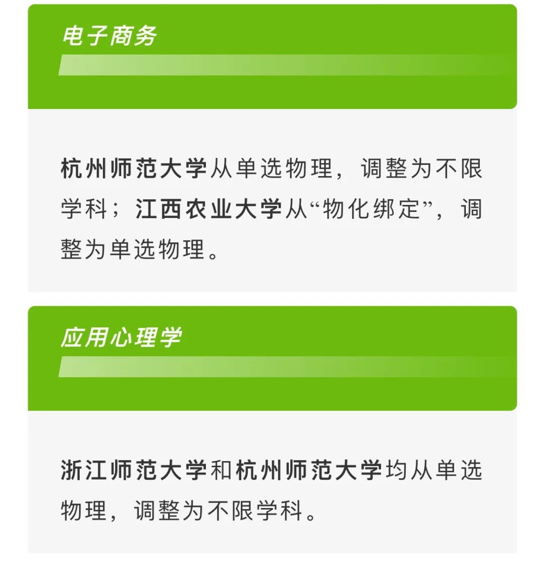 除了中医学专业大面积调整选考科目要求,在《2027年及以后普通高校招生专业选考科目要求》中,部分高校对护理学、汉语言文学、建筑学、电子商务、应用心理学等专业,也做了微调。比如——