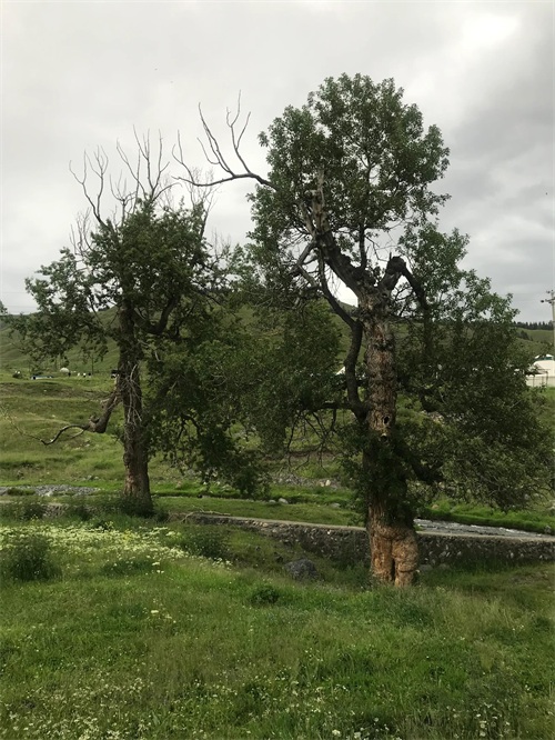 感觉白杨沟的农家乐比往年更多了。没去瀑布那里,一是因为观光车价格过高(往返6公里,票价45元/人),二是看天色要下雨了。在路边的草场上转了一圈,返回途中在河(不知是不是叫白杨河)看到了两棵造型很好的树,远看有点像榆树。
