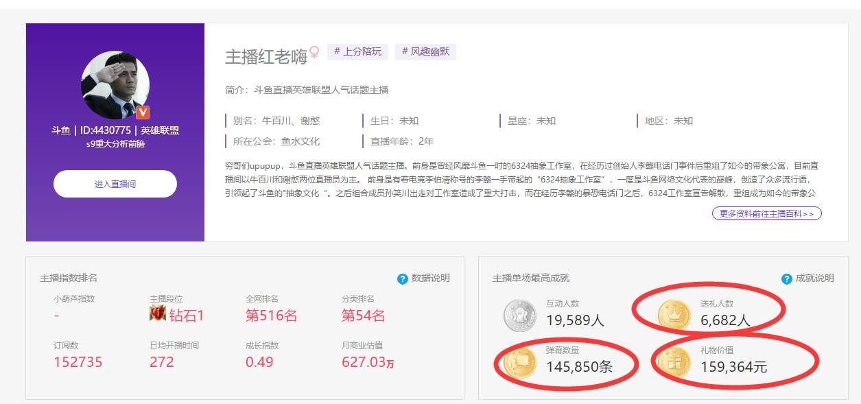 根据小葫芦的最新数据显示,其当场的直播最高成就已刷新至送礼人数6682人,弹幕数量达到145850条,单场收入达到16万之多!