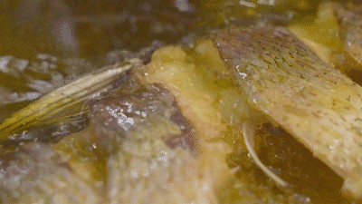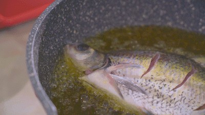 在超市选一条中等个头的武昌鱼,杀好回家洗净,准备两个大蒜切末,锅中倒入较多的食用油,小火炸鱼至基本干,大概20分钟,捞出待用。