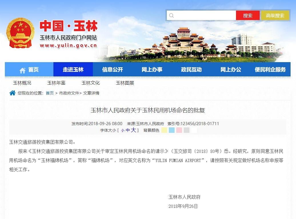 玉林市政府网公布了《玉林市人民政府关于玉林民用机场命名的批复》,原则同意玉林民用机场命名为“玉林福绵机场”,简称“福绵机场”,对应英文名称为“YULIN FUMIAN AIRPORT”。