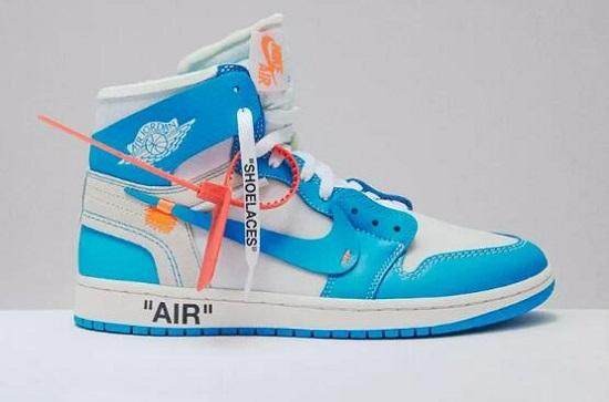 传说中的北卡蓝,十分亮眼。这双球鞋可以说是今年第三受关注的OFFWHITE X AJ1合作款球鞋。