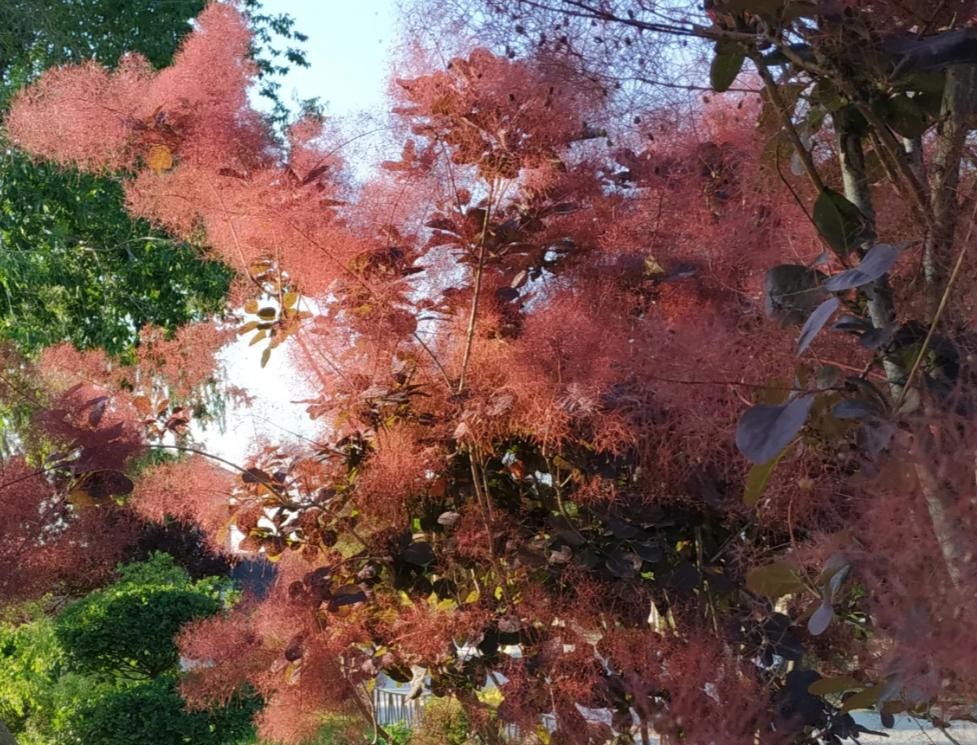 近年备受青睐的彩叶树种,其嫁接它砧木源自山区野生的黄栌。红栌的叶子全年呈现火红色,每年四月左右开花,花型如烟波浩渺,极具梦幻色彩。