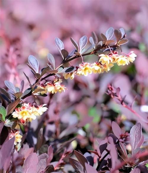 又称紫叶小檗,其叶片颜色因土壤差异而有所变化。常被用作园路镶边绿篱植物,红叶与绿叶相映成趣,视觉效果独特。