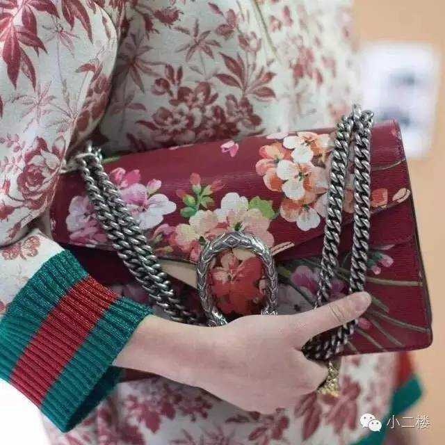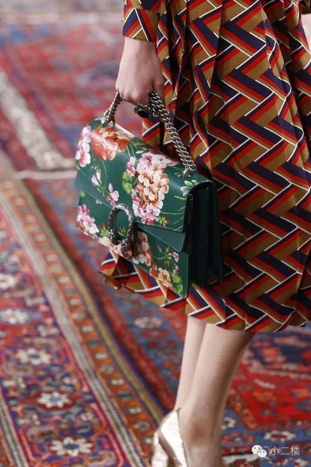 OK,纠正了发音,接下来我们来看看Gucci近两年的设计,真的是没想到,有一天Gucci能美到让我眼里只有它。Gucci 自从今年一月份首席设计师 Alessandro Michele 上任,带来了前所未有的改变,在原有的基础上加入了不少色彩和花纹,这一季以花为主导元素的单品让人心花怒放,Gucci 标志性的绿红得以最好的彰显,被这些绽放的花花绿绿渲染了无限春意。