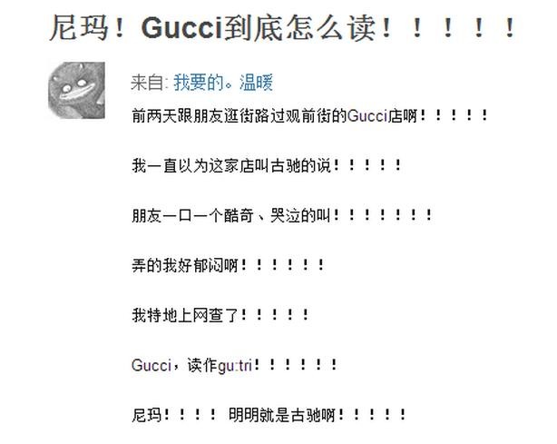 周围的伙伴是不是大多都是ku qi的发音?“ku qi最近出的钱包还挺好看的!” “咱俩溜一圈ku qi,我给我妈看看包。” 日常是这样的,有木有?有木有!那么,Gucci到底“哭”不“哭”?