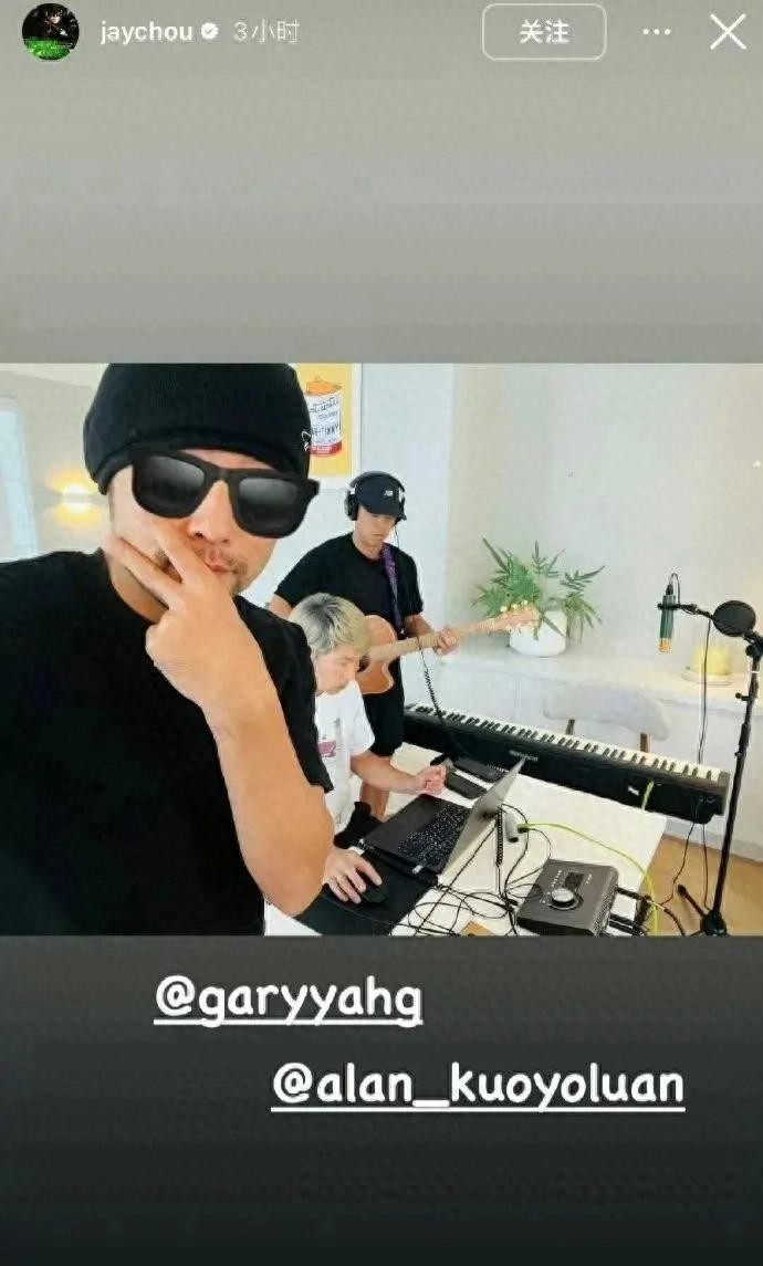 而周杰伦也在社交平台上传了在录音室比耶的照片。
