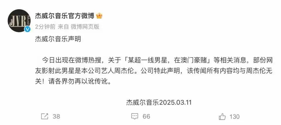 周杰伦豪赌传闻风波:经纪公司友人帮辟谣