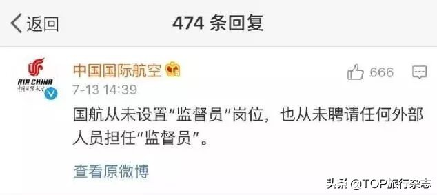 但国航官方微博在其官方微博评论中回应称,"国航从未设置'监督员'岗位,也从未聘请外部人员担任'监督员'。"