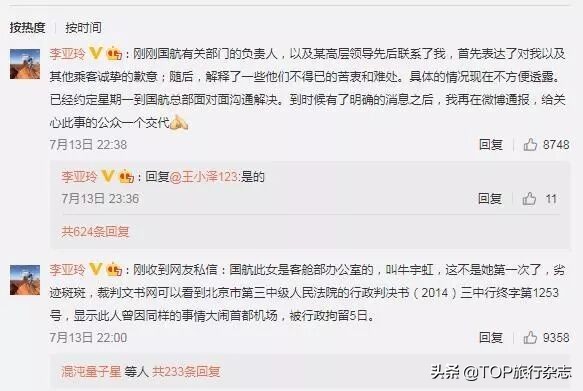 13日晚间,李亚玲在微博上又曝出自称"监督员"的女子名为国航客舱服务部办公室的牛宇虹,称其有多次类似事件记录,劣迹斑斑。