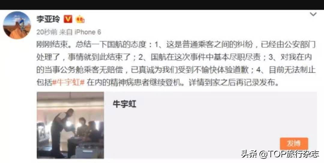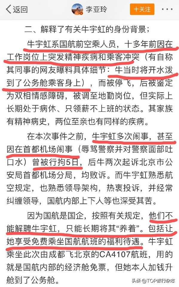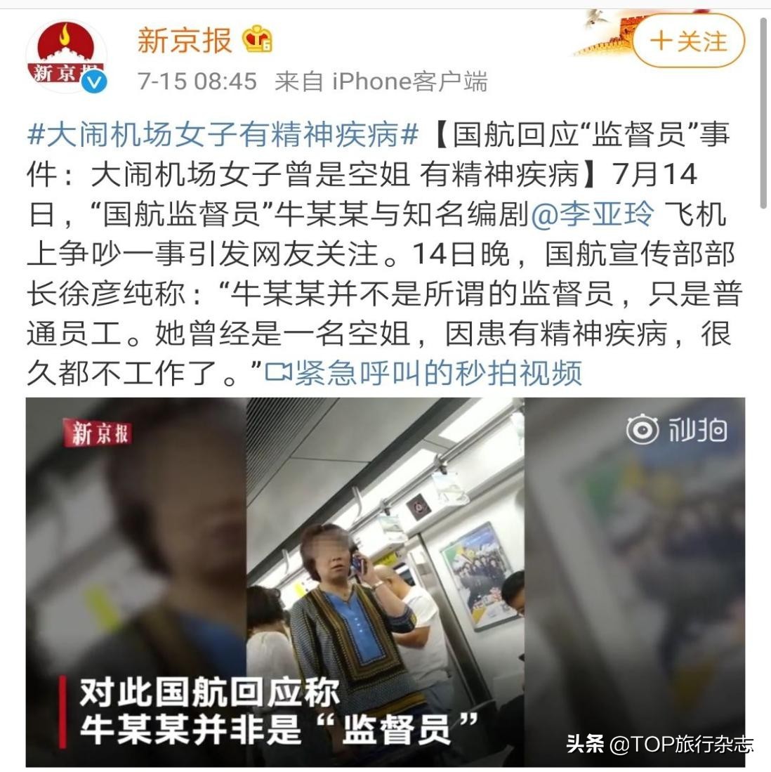 而国航今早回应监督员事件:牛某某患有精神病,很久都不工作了。