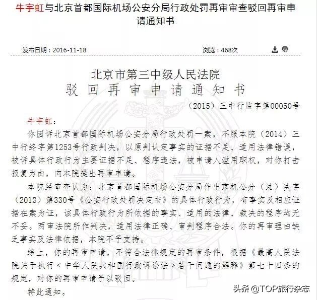 从裁判文书网可以看到北京市第三中级人民法院的行政判决书(2014)三中行终字第1253号,显示此人曾因同样的事情大闹首都机场,被行政拘留5日。李亚玲在微博中表示。